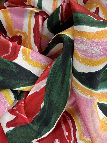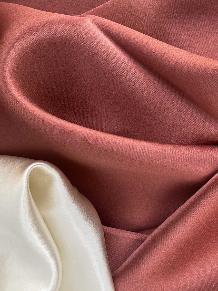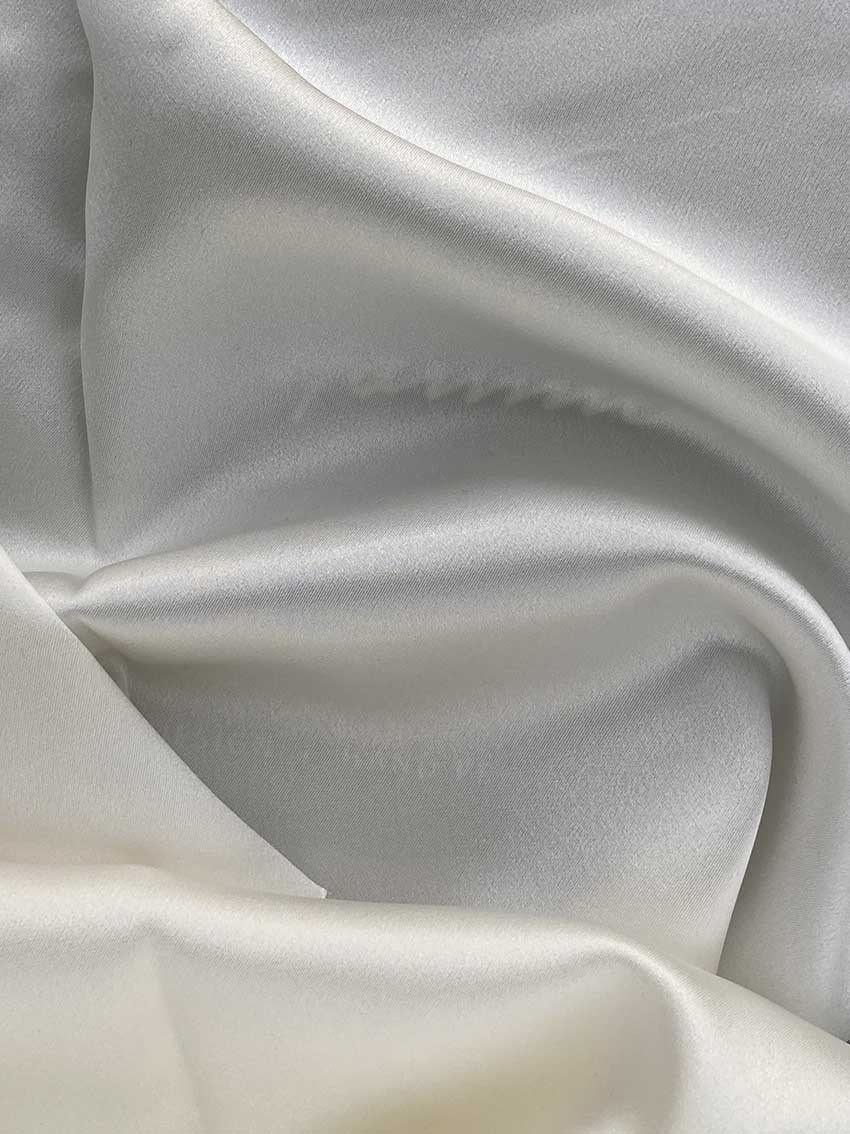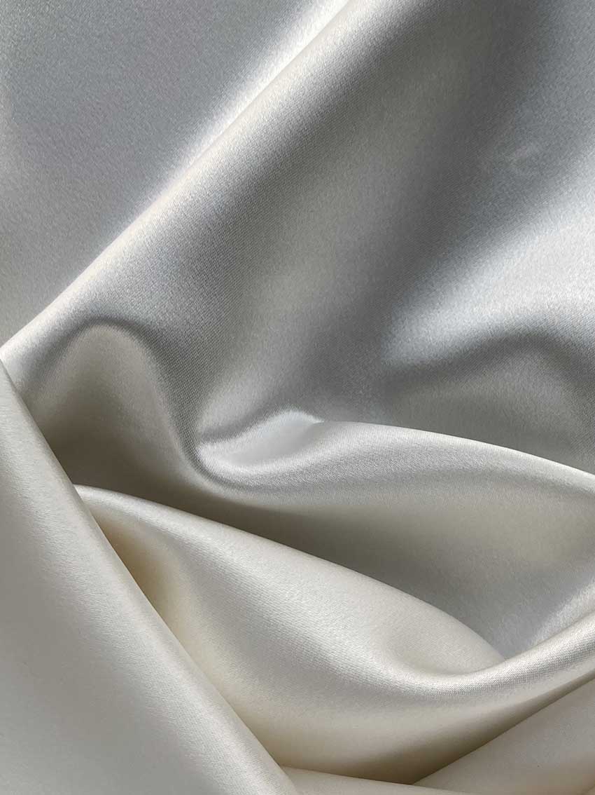 A medium weight, shiny fabric with a similar look and drape to charmeuse. Distinguished by its luxurious design, this high-quality fabric is perfect for eveningwear, bridal/wedding, and lingerie. The face side of this fabric features a glossy satin finish while the back has a traditional pebbly crepe texture.